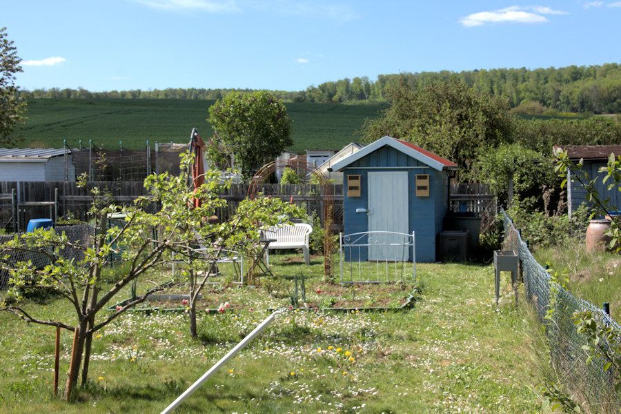 Unsere im letzten Jahr gebaute Hütte im Glauberger Garten am Riedweg ist frisch gestrichen. In den Insektenhotels sind schon Mauerbienen eingezogen.